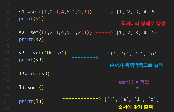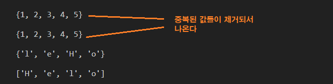 - 리스트와 딕셔너리만큼 자주 쓰이지는 않지만 중복된 값을 제거하고자 할 때 많이 쓰인다.