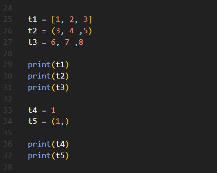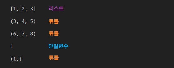 - 튜플안에 값이 하나만 존재하게 하고 싶은경우 t1= (1, ) 이 형태처럼 뒤에 쉼표(,)를 붙여줘야 한다.