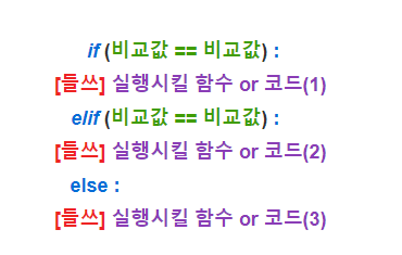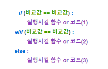 - 파이썬에서는 조건문을 쓸때 아래와 같은 구조를 지닌다. 자바보다 간단해 보인다. 자바와 다르게 { }를 안써서 그런지 코드도 깔끔하다.
