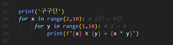 반복문을 활용하여 "2~9까지 숫자를 담은 x 리스트 와 "1~9까지의 숫자를 담은 y리스트를" 이용해 구구단도 만들 수 있다.