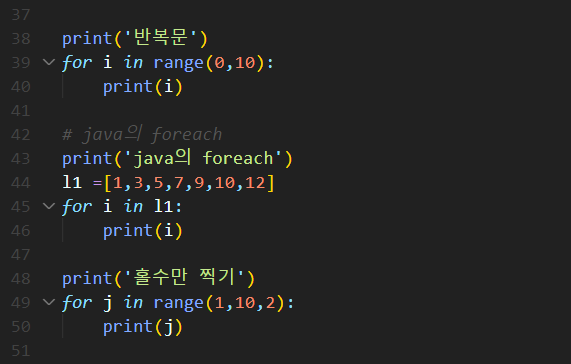 2. " for i in 리스트 : " 만들어진 리스트를 사용해 차례대로 i 변수에 값을 집어 넣을 수 있다.