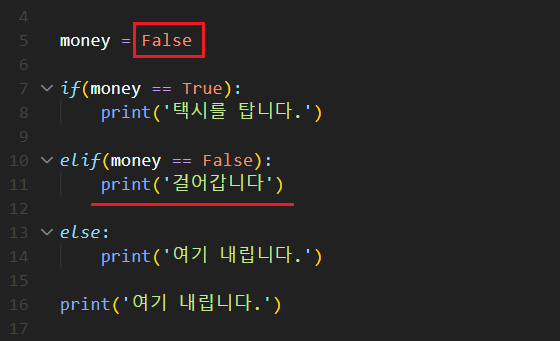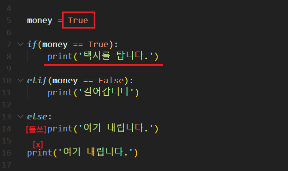 money == True 조건이라면 즉, 돈이 있으면 택시를 탑니다를 출력하고, 돈이 없으면 걸어갑니다를 출력, 그게 아닐경우 여기내립니다를 출력하는 조건문이다.