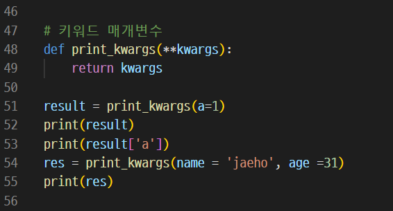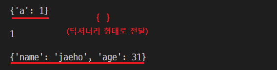 출력된 결과를 보자. print_kwargs( ) 함수를 호출하게 되면 키워드 매개변수(kwargs) 값을 리턴한다. 파라미터값으로 a = 1 을 넣고 함수를 호출하면 { 'a' : 1 } 이렇게 딕셔너리 형태로 저장한다.