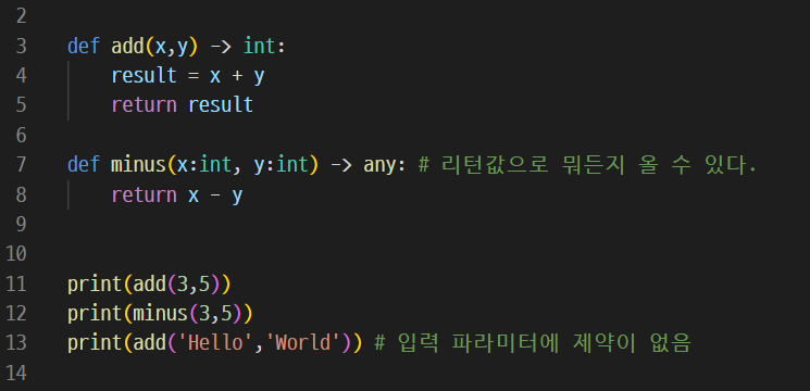 2. 함수(x : int, y: int) : 파라미터값을 보면 옆에 콜론이 붙어있다. 콜론 옆에 보이는 int가 주석을 적어놓은 것이다. x : int 같은 경우 x는 정수값을 받겠다고 주석처리 해주는 것이다.