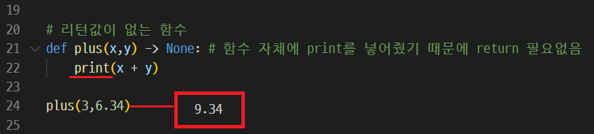 함수 자체에 print( ) 함수를 넣어줌으로써 따로 return값을 주지 않고, 함수를 실행시키는 것만으로 출력할 수 도있다.