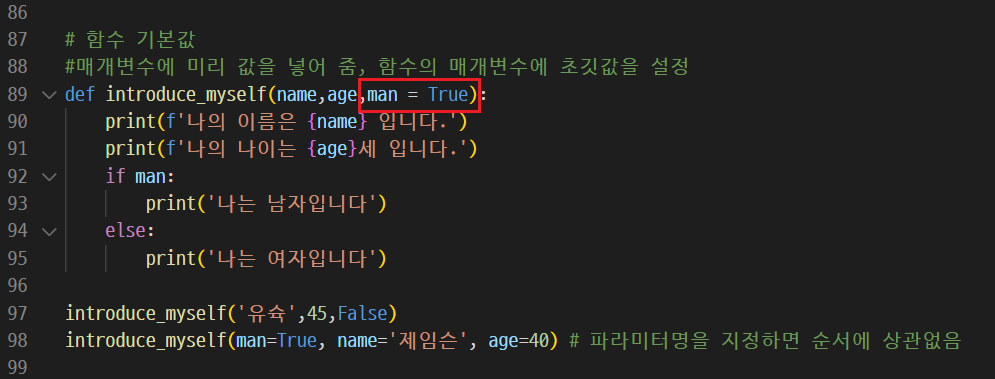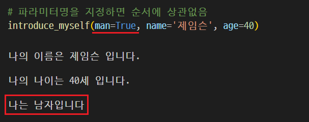 반대로 man = True라고 파라미터값을 주게 되면 당연히 조건에 부합하기 때문에 "나는 남자입니다"를 출력한다. 여기서 한가지 봐야할 것은 파라미터값은 원래 주어진 순서대로 넣어야 각각의 자리에 맞게 값이 들어가지는데, 파이썬에서는 파라미터 명을 지정하고 값을 주면 순서에 상관없이 값을 넣을 수 있다.