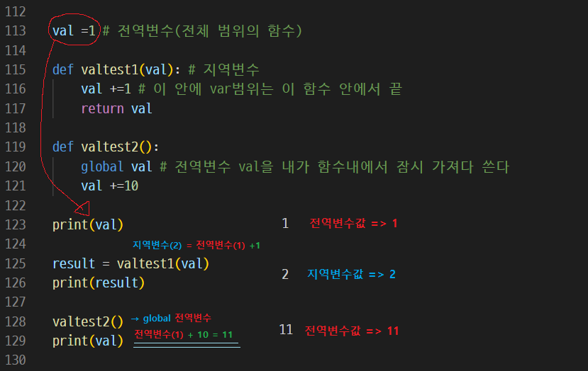2. 지역변수(Local Variable ) : 지역변수는 함수 내에서만 사용가능한 함수다. 함수가 호출되면 만들어져서, 함수의 실행이 끝나면 같이 사라진다.하지만 함수에서 지역변수 말고 전역변수를 가져다가 쓸 수 있는 방법도 있다. 바로 global 키워드를 사용하면 전역변수를 가져와서 함수에서 사용할 수있다. 당연히 값이 바뀌는것도 전역변수의 값이 바뀐다.