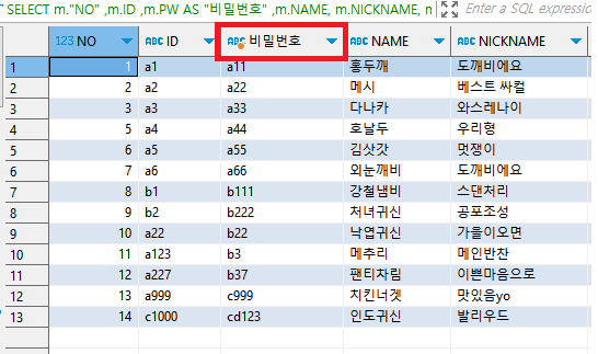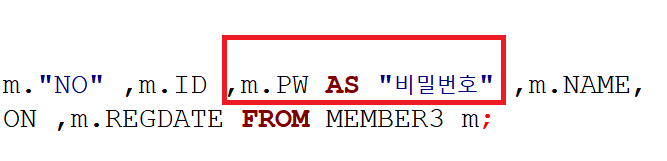 저렇게 컬럼명 뒤 " " 사이에 원하는 컬럼명을 넣으면, 적었던 컬럼명으로 바껴서 조회가 된다.(' ' 한자리 따음표 (x), 이것만큼은 두자리 따음표 " "(o) )