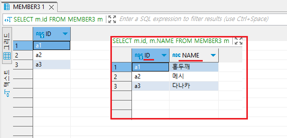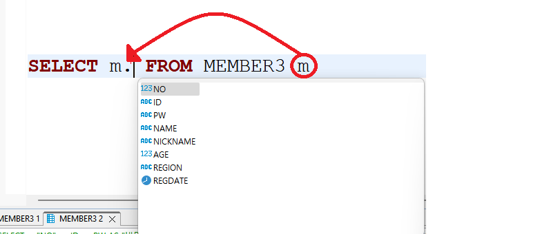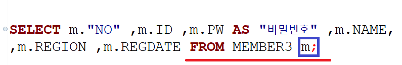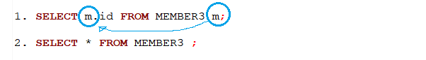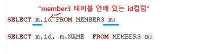 : 테이블에 전체 데이터를 조회하는것이 아니라 일부분만 조회하는것이다. 즉, 내가 원하는 컬럼만 선택해서 조회할 수 있다. 그림에서 보는 것처럼 테이블 MEMBER3 이름 뒤에 적혀있는 m이(보통 테이블명은 대문자, 약어는 소문자로 표시한다) MEMBER3 테이블의 약자(별칭)이다. 테이블명이 길면 전부 쓰기가 힘드니 저렇게 줄여서 쓸 수 있게 해놓았다. 근데 꼭 테이블명의 앞자리를 적는건 아니고 자기가 알아보기 쉽게 적으면된다.