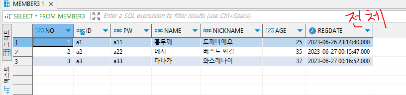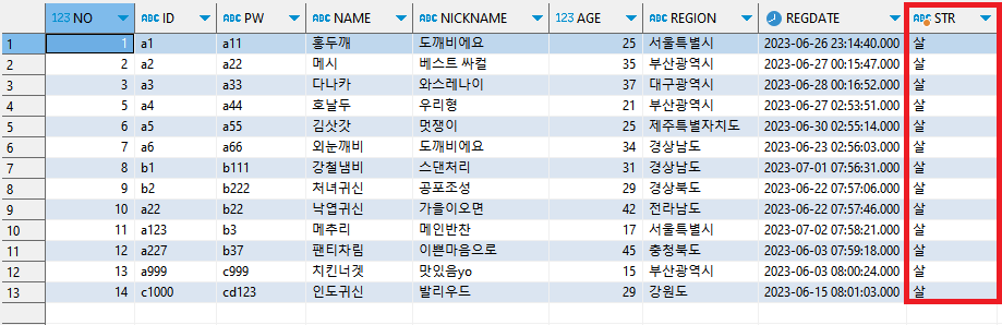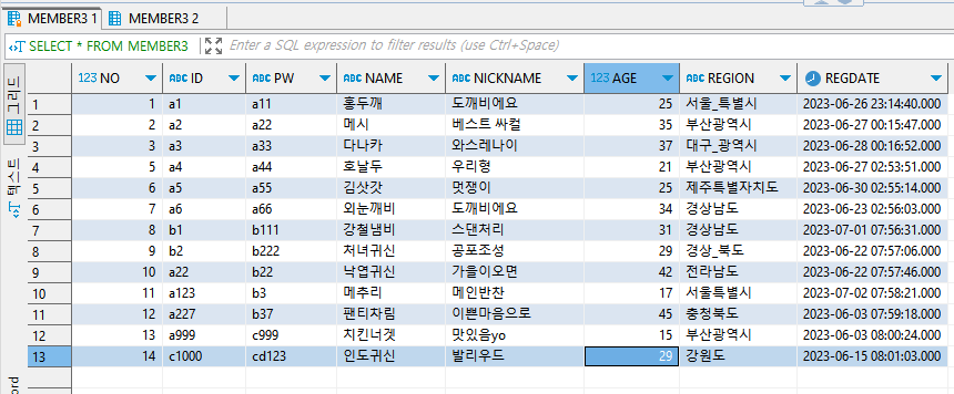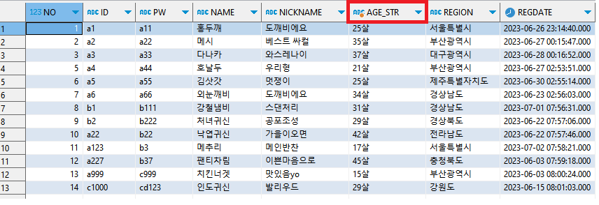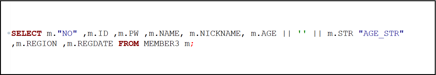 점점 쿼리문이 길어져서... 이미지를 캡쳐해서 가져오는게 좀 더 가독성이 좋을것 같다. 위 그림과 같이 각각의 컬럼명을 명시해주고 데이터를 조회하면 "AGE_STR" 컬럼이 추가된 모양의 MEMBER3 테이블을 불러올 수 있다.