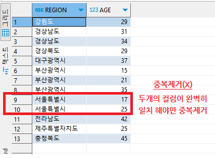 그림과 같이 '지역' 이 중복이 되는데도 그대로 나오고, '나이' 가 중복이 되는데도 그대로 나온다. 저렇게 컬럼을 두개 적게되면 두 컬럼을 하나의 그룹으로 묶어서 중복을 계산하기 때문에 두 컬럼의 값이 똑같이 일치해야만 제외시킨다.