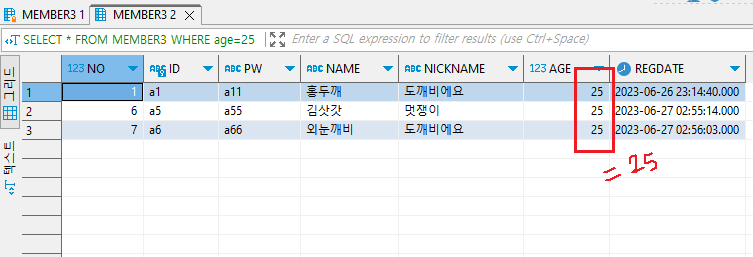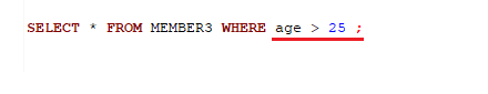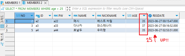 WHERE age > 25 라는 조건을 줘서, 나이가 25살 이상인 멤버만 조회하여 다른 결과를 보여준다.