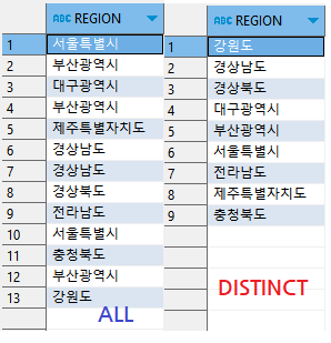 왼쪽이 REGION 컬럼의 모든 값이고, 오른쪽이 REGION 컬럼을 기준으로 중복된 값을 제외시킨 결과다.