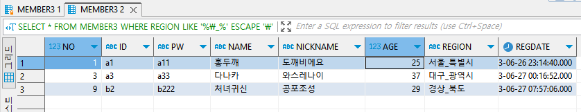 이렇게 REGION 컬럼 몇군데 _를 추가해 보았다. ESCAPE 식별자와 LIKE 연산자를 써서 저 부분의 데이터만 조회해보자.