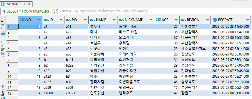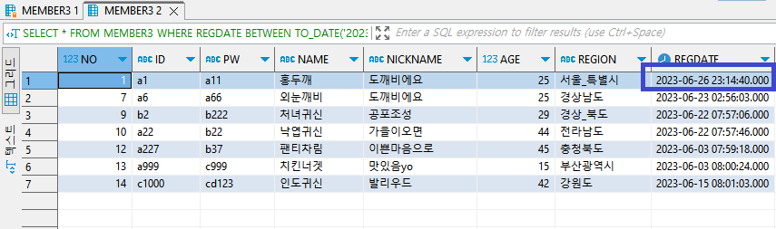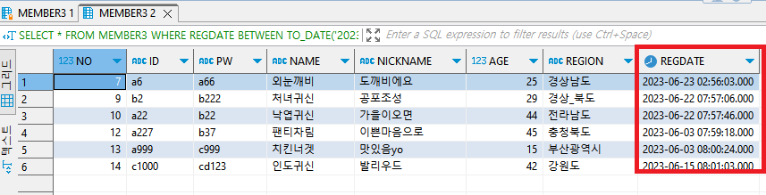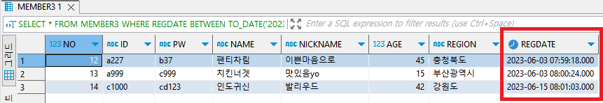 SELECT * FROM MEMBER3 WHERE REGDATE BETWEEN TO_DATE ('2023-06-01', 'YYYY-MM-DD' ) AND TO_DATE('2023-06-20','YYYY-MM-DD');