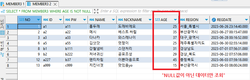 반대로 IS NOT NULL을 조건으로 적으면 AGE 컬럼에서 " NULL" 값이 아닌 데이터들만 조회하여 우리에게 보여준다.