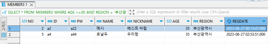 SELECT * FROM MEMBER3 WHERE AGE >= 30 AND REGION = '부산광역시';