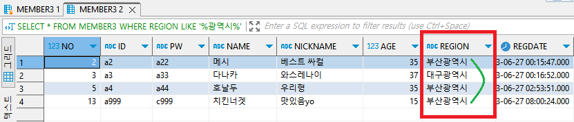 SELECT * FROM MEMBER3 WHERE REGION LIKE '%광역시%';