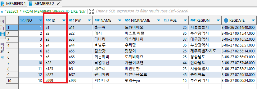 %a__% 이렇게 적으면 ID 컬럼에 a가 포함되면서 글자수가 3개인 값들의 데이터만 보여준다. (근데 이렇게 적으니깐 세자리 글자랑 네자리 글자 다 조회해주던데.... 몇번 다시 해봐야겠다)