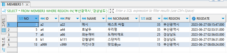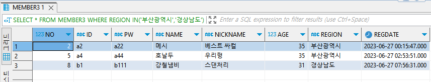 SELECT * FROM MEMBER3 WHERE REGION IN ('부산광역시', '경상남도');