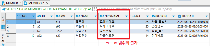 SELECT * FROM MEMBER3 WHERE NICKNAME BETWEEN '가' AND '딯';