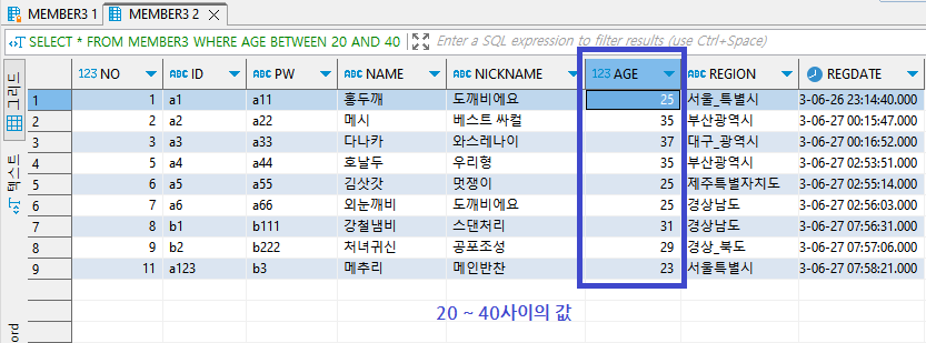 SELECT * FROM MEMBER3 WHERE AGE BETWEEN 20 AND 40;