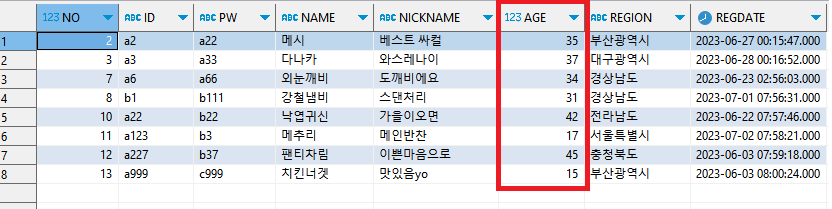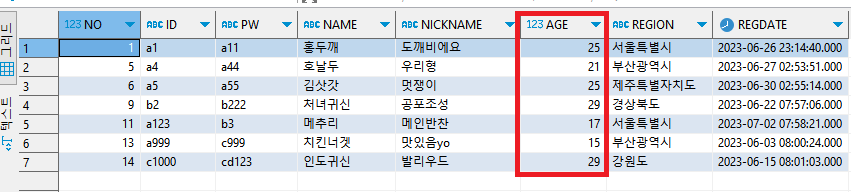 먼저 나이 필드에 임의로 NULL값을 몇군데 주었다.