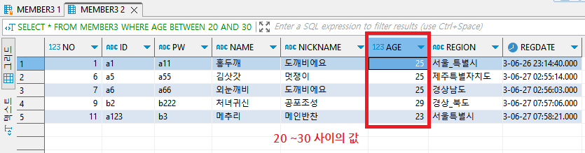 SELECT * FROM MEMBER3 WHERE AGE BETWEEN 20 AND 30 ;
