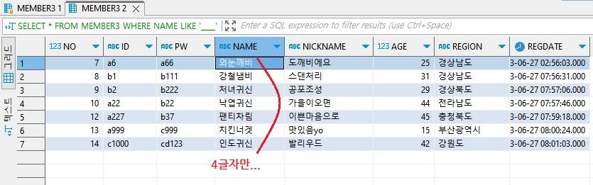 SELECT * FROM MEMBER3 WHERE NAME LIKE '____';