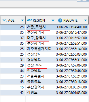 REGION 컬럼에서 광역시가 포함된 모든 데이터 조회할 수도 있다.