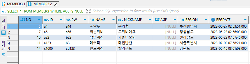 SELECT * FROM MEMBER3 WHERE AGE IS NULL;