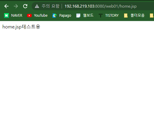 나는 home.jsp파일을 만들어 "home.jsp 테스트용" 이라는 문구를 넣었다. 서버주소를 입력하면 정상적으로 화면에 문장이 출력되는것을 볼 수 있다.
