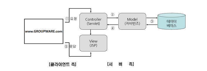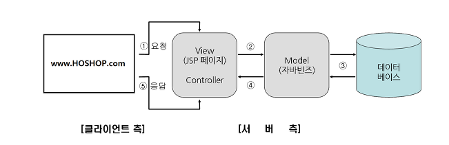 - 웹 브라우저의 요청을 받은 JSP는 자바빈이나 서비스 클래스를 사용해서 작업을 처리하고, 결과를 클라이언트에 출력