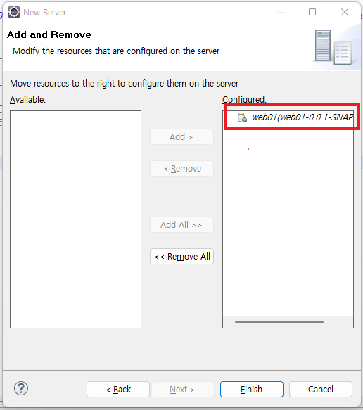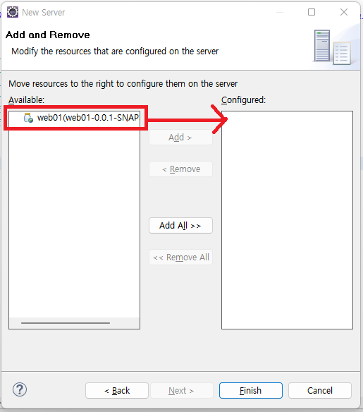 Add를 눌러 아까 만들었던 Dynamic Web Project 폴더를 이동시켜준다. (오른쪽이 활성화!)