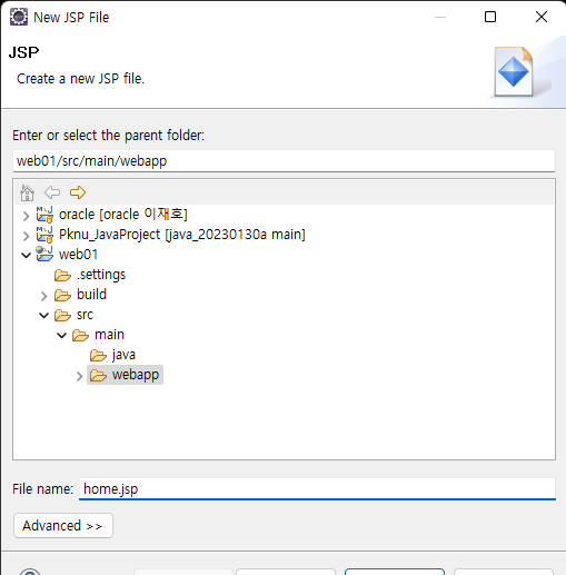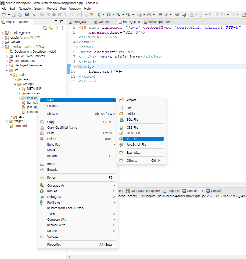 ③ webapp → WEB-INF → jsp 파일을 생성하여 아무 문장이나 입력해보자.
