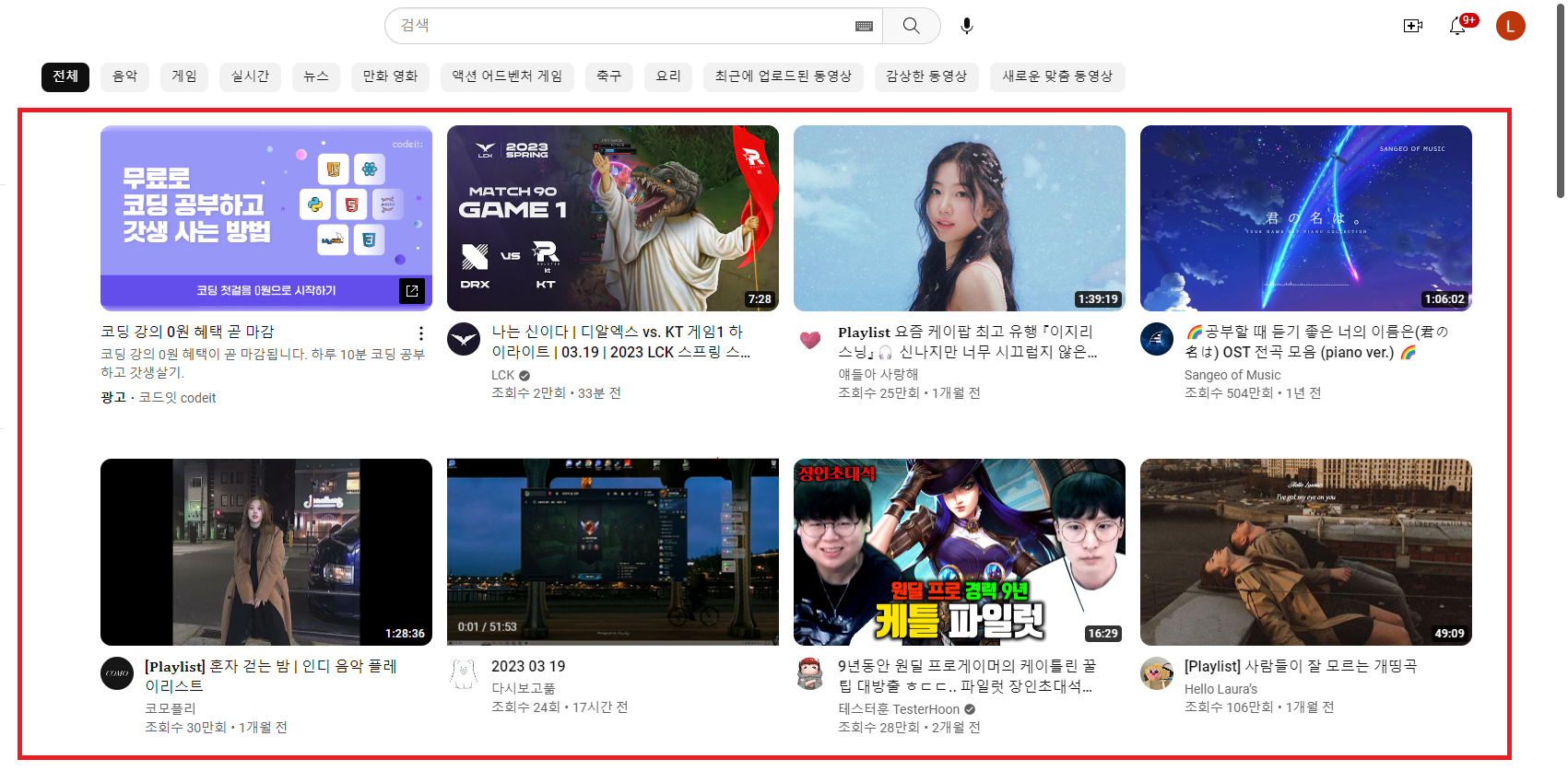 내 유투브 계정의 추천영상이다. 매번 클릭할 때마다 맞춤광고와 추천영상을 보여주는 동적데이터!!