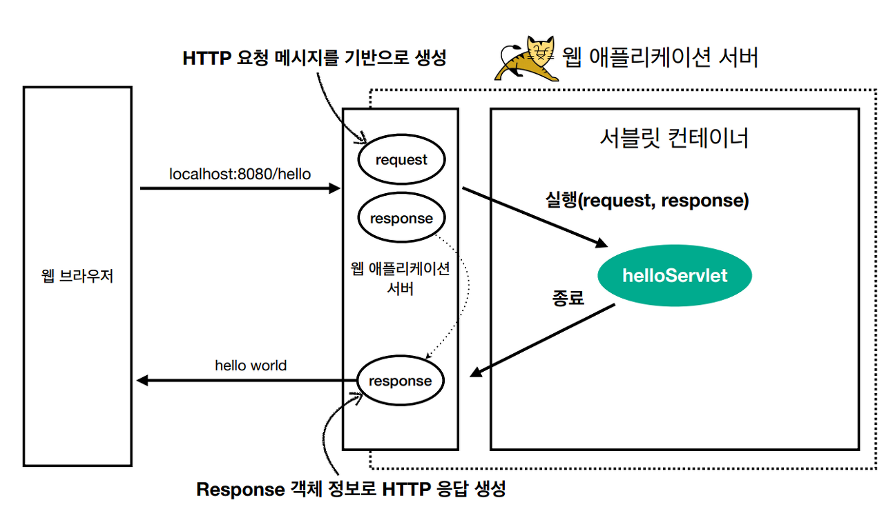 서블릿은 그 독립적으로 동작하지 않고, 서블릿 컨테이너라는 다른 자바 응용프로그램의 제어를 받는다. 가장 대표적인 서블릿 컨테이너는 톰캣이다. 서버가 요청을 받으면 서버는 요청을 서블릿 컨테이너로 전달하고 서블릿 컨테이너는 이를 서블릿으로 전달한다.