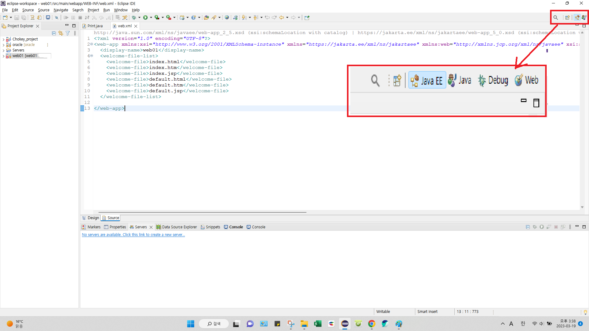 이클립스를 쓰다보면 맨 오른쪽에 Java 와 java EE 두가지 버전이 있는것을 볼 수 있다. 보통은 Java를 눌러놓고 개발을 진행하지만 웹을 개발하기 위해서는 Java EE 개발환경을 이용해야한다.