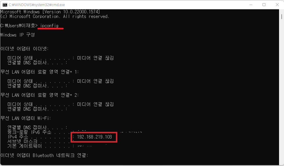 밑에 보이는 IPv4 주소가 현재 내 컴퓨터의 포트번호다. 그럼 밑에 주소형태와 같이 입력해주자.
