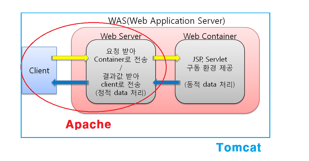 똑같이 아파치에서 만든 http서버로, 웹서버인 Apache와 다른 특징을 꼽으라 한다면 WAS는 웹서버 + 서블릿이 합쳐진 형태로 컨테이너 기능을 한다는 것이다. 클라이언트의 요청을 받아 요청을 처리하고 다시 클라이언트에게 응답해주는 역할을 하는것이 서블릿 컨테이너 이다. 웹 서버에서 넘어온 동적인 페이지를 읽어들여 프로그램을 실행하고 그 결과를 다시 html로 재구성하여 아파치에게 되돌려 준다.