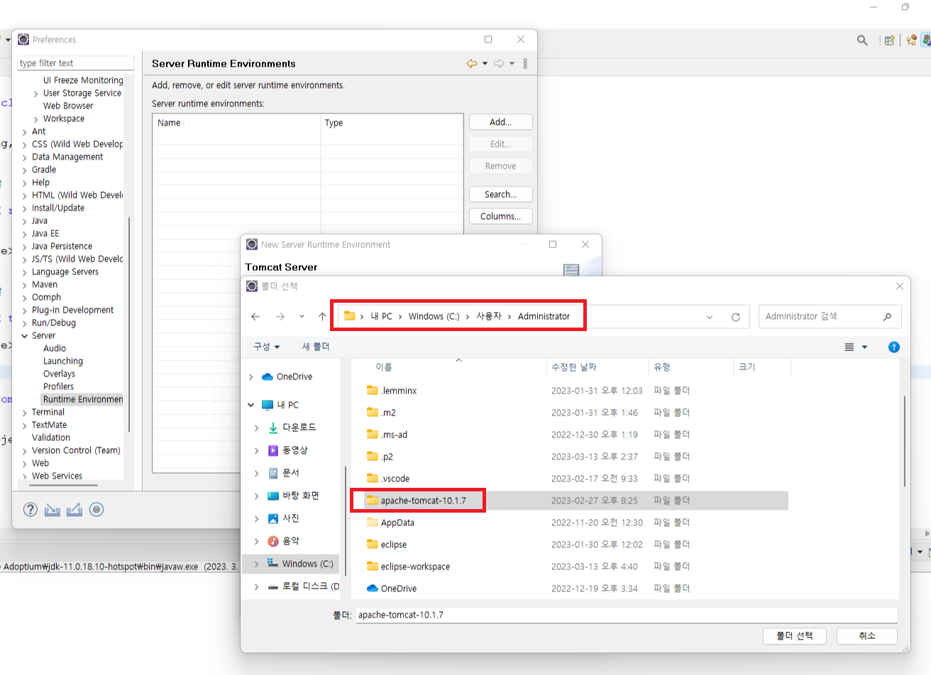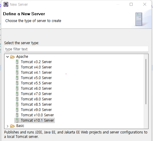 Next를 눌러 Browse를 클릭후 톰캣10을 다운받은 폴더를 클릭해준다.(폴더 안에 들어있는 bin보다 상위폴더 선택)