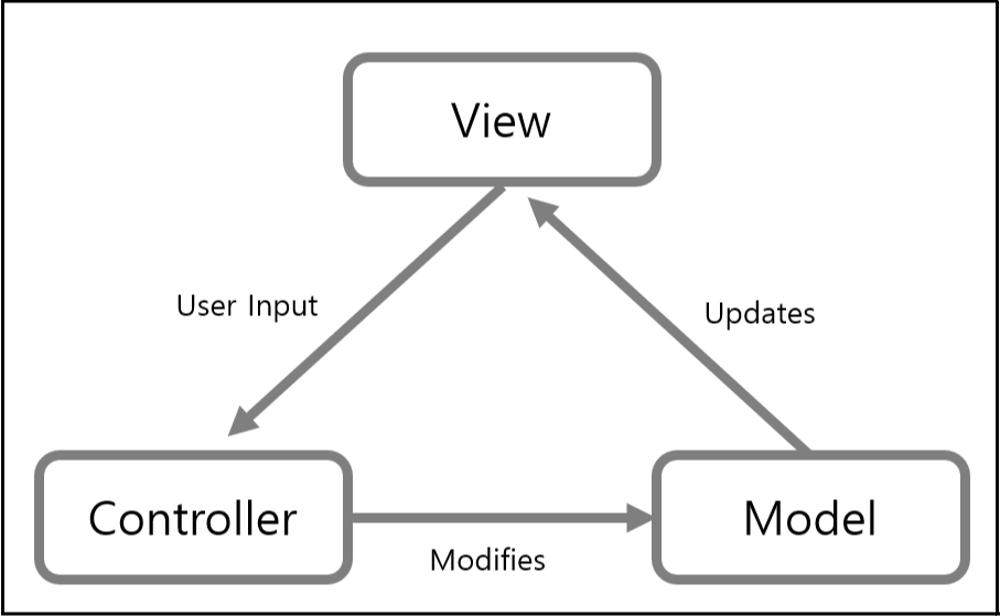 MVC( Model-View-Controller), 애플리케이션을 세 가지 역할로 구분한 개발 방법론이다. 아래의 그림처럼 사용자가 Controller를 조작하면 Controller는 Model을 통해 데이터를 가져오고 그 데이터를 바탕으로 View를 통해 시각적 표현을 제어하여 사용자에게 전달하게 된다.