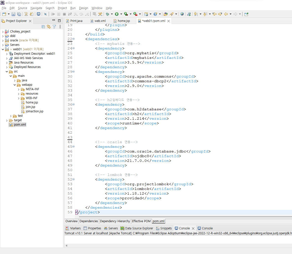 오라클과 나중에 쓰게될 h2임베디드 까지 총 4개를 추가했다. 나중에도 필요한 라이브러리가 있으면 POM파일에 추가해서 써야한다.