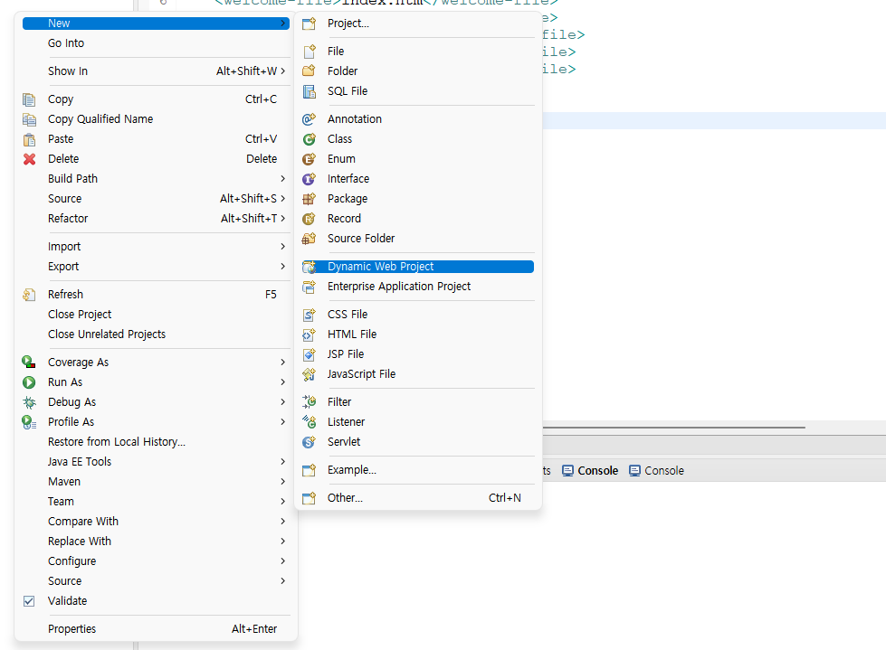 ④ 자바개발 환경을 java EE로 변경 후 Dynamic Web Project 폴더를 생성한다.