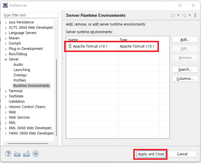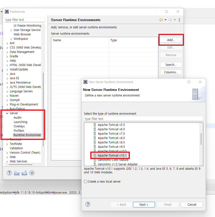 ③ Runtime Enviroment에서 톰캣10 서버를 add한다.