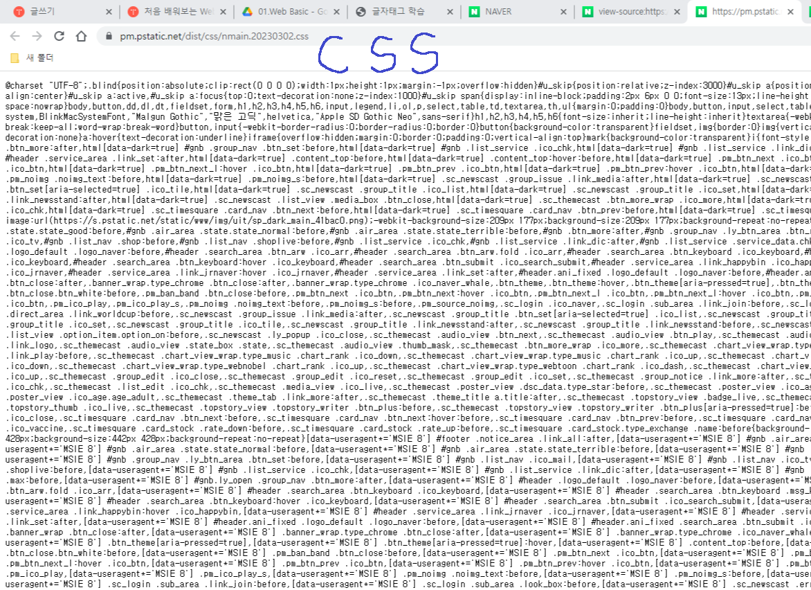 보기에는 전혀 알아볼 수 업는 문자들로 도배 되어있지만 왼쪽에 보이는 저 수많은 글자들이 css이다. (공백을 다 넣어서 쓰게 되면 용량이 크기 때문에 저렇게 한줄로 하여 파일을 만들어 놓는다.) 저 css 언어들이 네이버 html 텍스트에 적용되어 우리가 평소보는 네이버의 화면을 만들어준다.