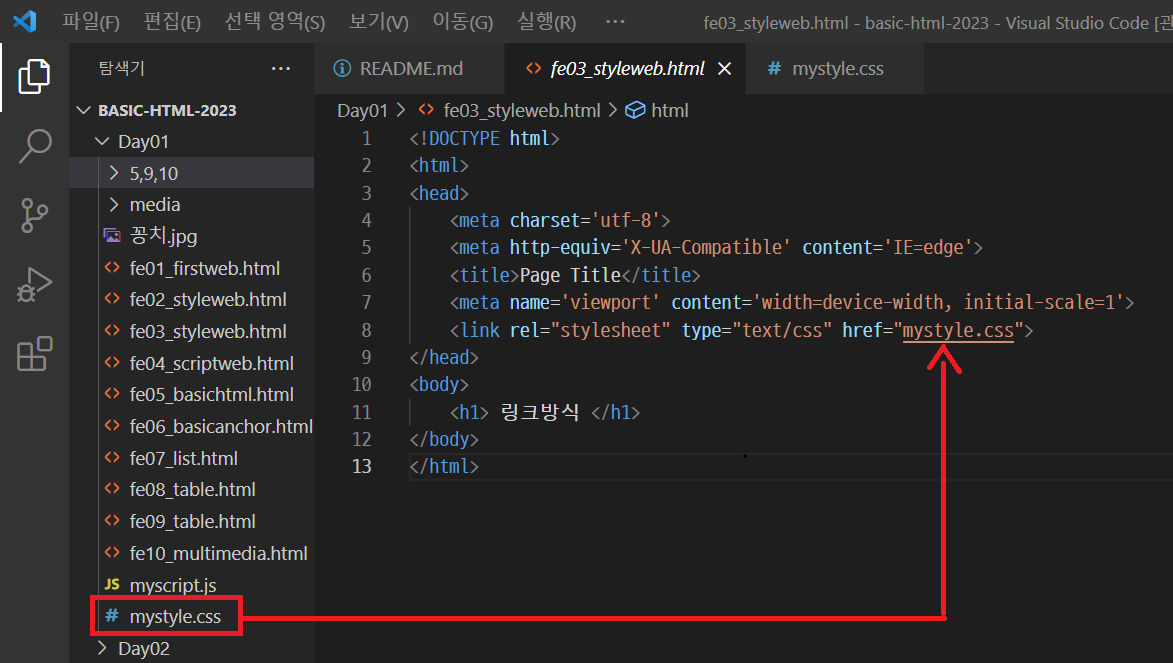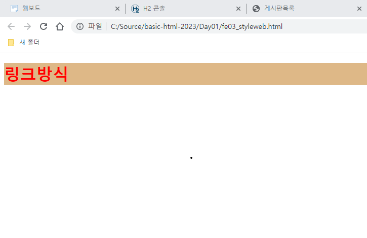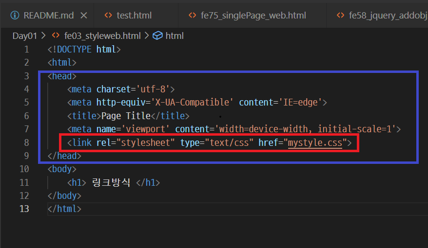 ③ 링크 방식 : <head>안에 <link> 태그를 주어 외부 문서로 css 파일을 불러와 작성하는 방법.