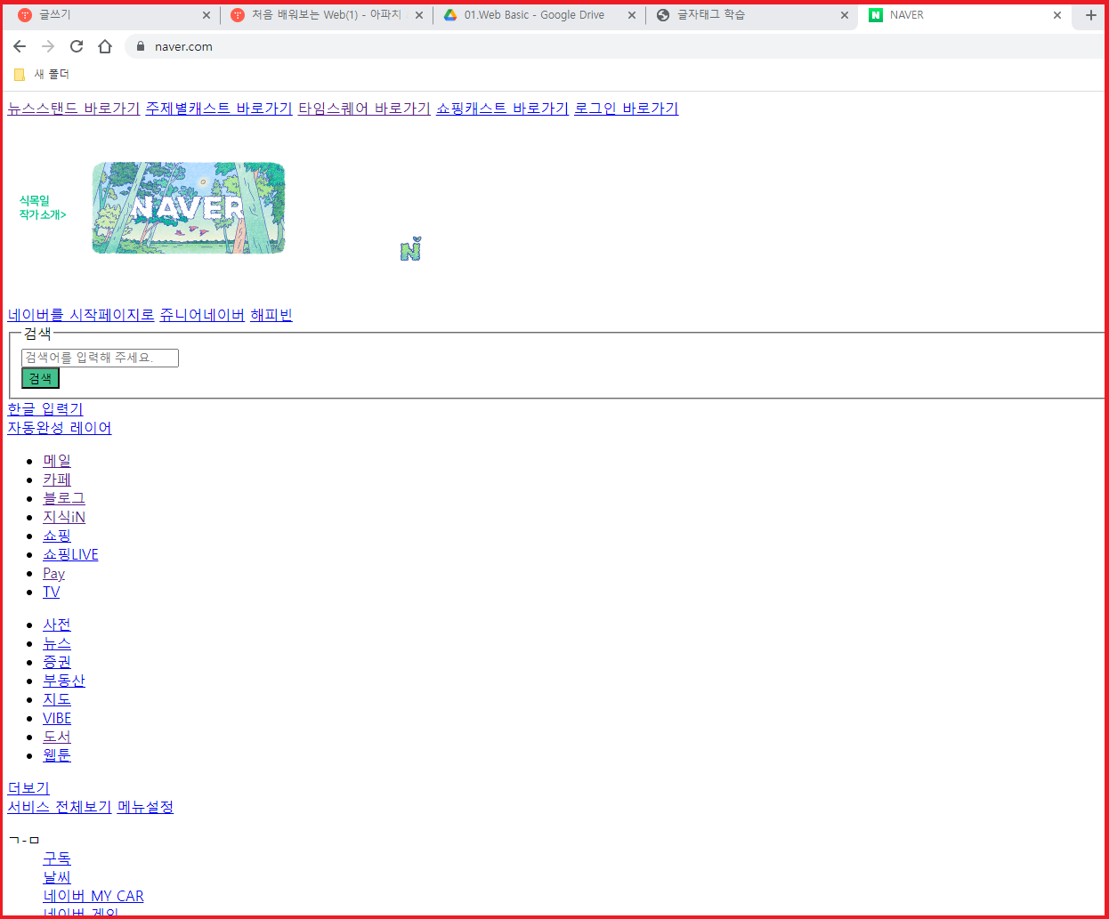 마찬가지로 우리가 흔히 사용하는 네이버, 구글 등 모든 웹사이트들은 html언어로 구성되어 있는것을 볼 수 있다. 왼쪽이 네이버 메인화면에 소스코드인데 css를 적용하지 않으면 저렇게 body에 있는 내용들로만 적혀진 투박한 화면을 볼 수 있다.