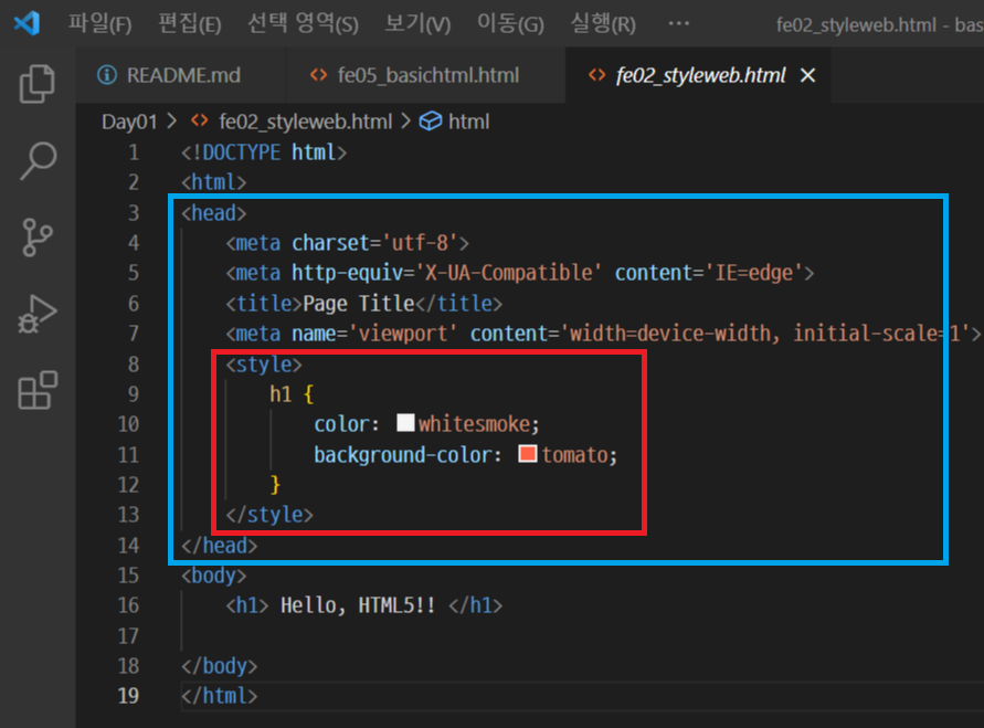 ② 내장 방식 : <head>안에 <style> 태그를 주어 html문서 내에서 바꾸는 방법.
