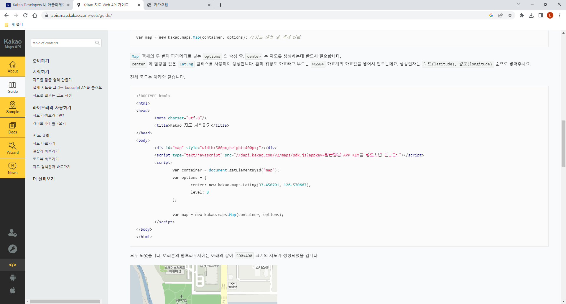 카카오에서 만든 지도 API이다. 이렇게 만들어진 여러종류의 API들을 쓰게되면 자바스크립트에서 특별한 기능을 구현할 수 있다. (지도, 날씨 ,번역, 자동검색 등...)